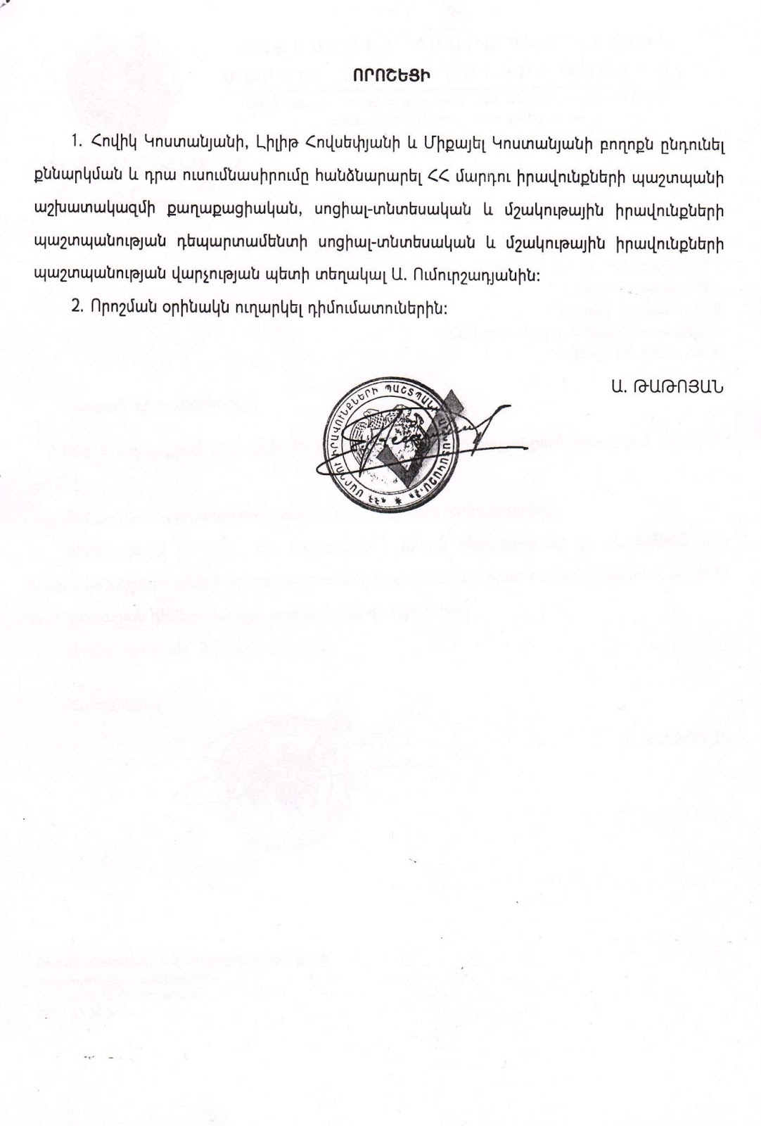 Հարգելի տիկին Զոհրաբյան, նկատի ունենալով, որ ԱԺ-ի թերեւս ամենահամարձակ ու անկաշկանդ պատգամավորը Դուք եք, եւ Ձեր խմբակցությունը ՀՀԿ-ից հետո երկրորդ տեղում է ՝որպես մեծամասնություն/իսկ մյուս առավել համարձակներն արդեն պաշտոններ ստացան գործադիրում՝դադարեցնելով իրենց պատգամավորկան լիազորությունները/, ուստի դիմում եմ Ձեզ՝ԱԺ ամբիոնից բարձրաձայնելու կամ՝պատգամավորական-գործընկերական տիրույթում լուծելու մի հիմնախնդիր, որի հետեւանքով Լոռու մարզի Ձորագետ ավանի Կոստանյան ընտանիքը հայտնվել է փողոցում հայտնվելու վտանգի առաջ։